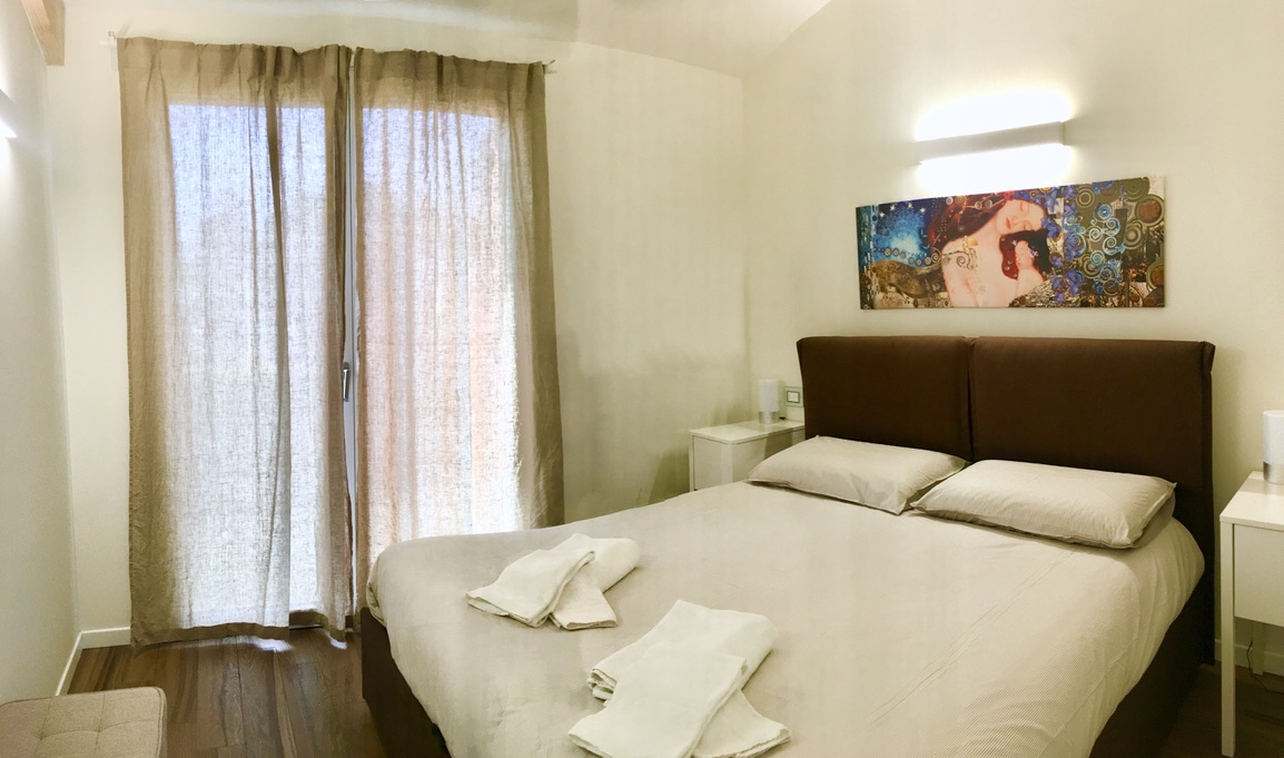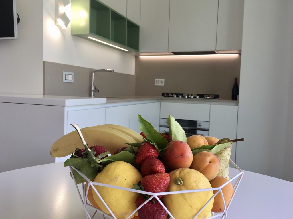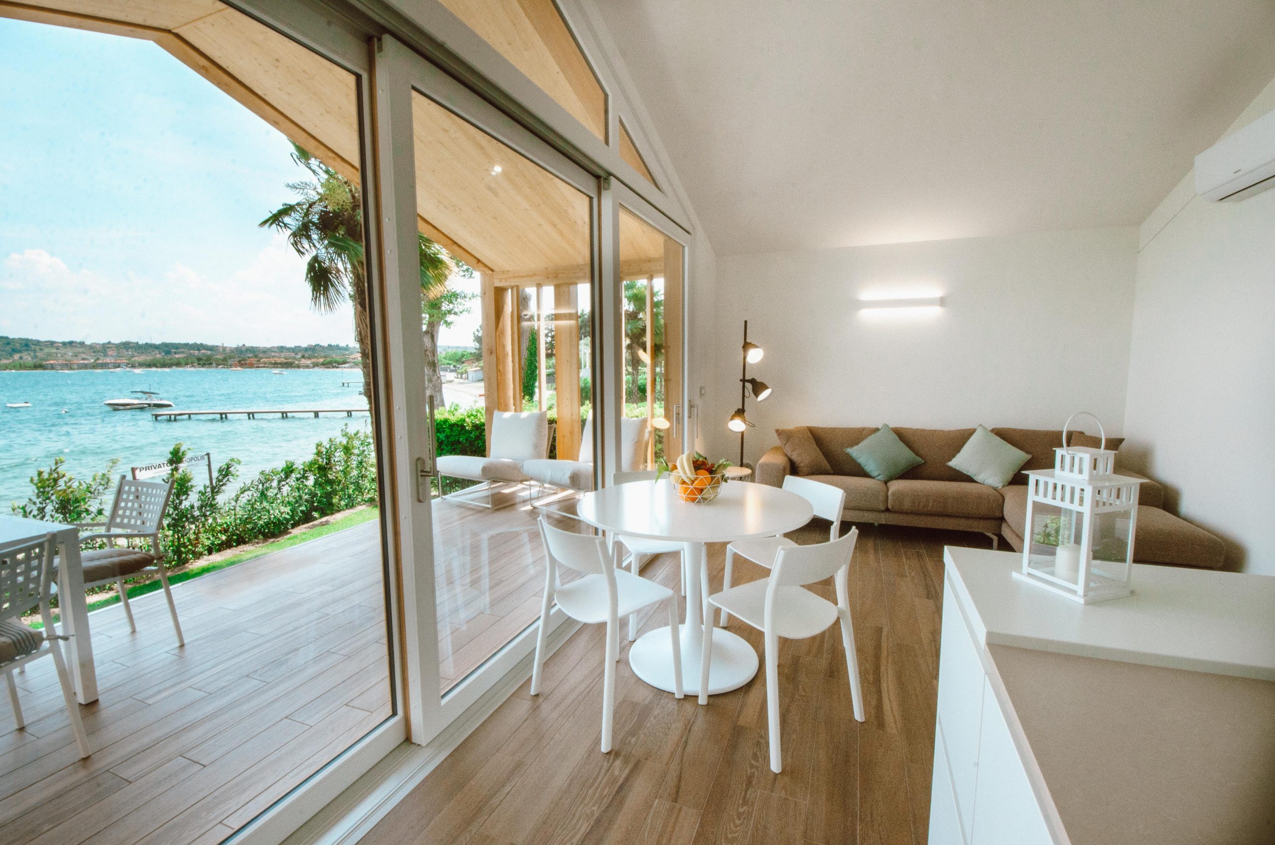 un bagno moderno, un soggiorno luminoso con cucina attrezzata e una finestra panoramica fronte lago di 12 mq dalla quale ammirare albe spettacolari.