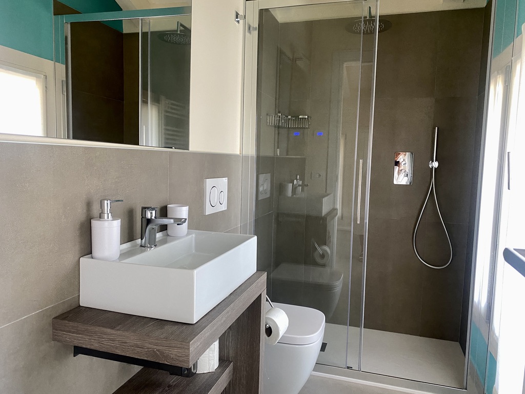 I due bagni con doccia completano gli interni con finiture moderne. Aria condizionata e riscaldamento garantiscono comfort in ogni stagione — Villa Ulivi è aperta tutto l’anno.